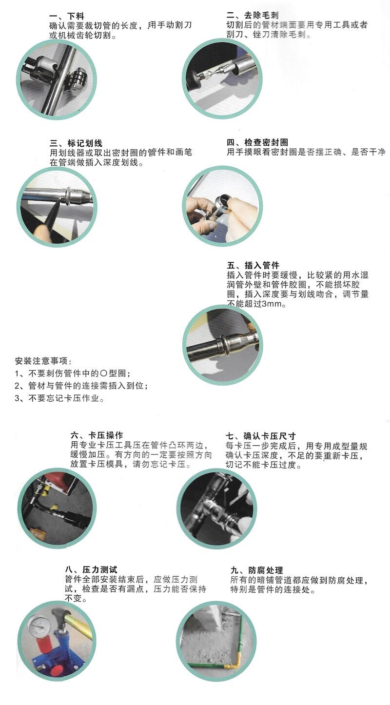 用專業卡壓工具壓在管件凸環兩邊,緩慢加壓。有方向的一定要按照方向放置卡壓模具,請勿忘記卡壓。